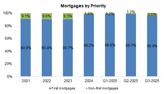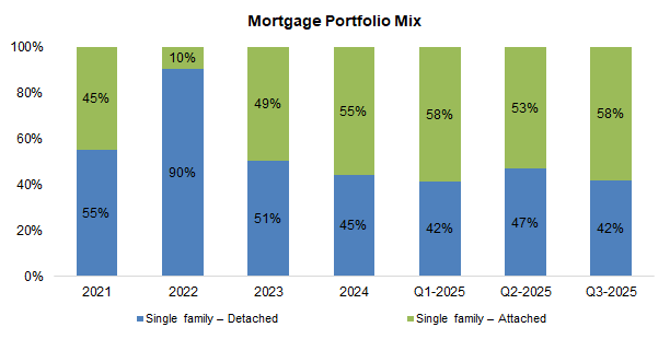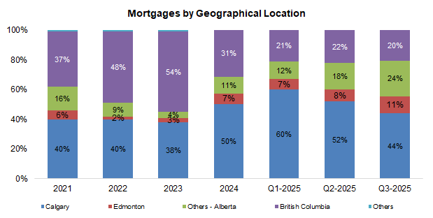 First mortgages fell 2 pp, implying slightly higher risk, but remain above the five-year average of 94%, with the portfolio still concentrated in AB and B.C.