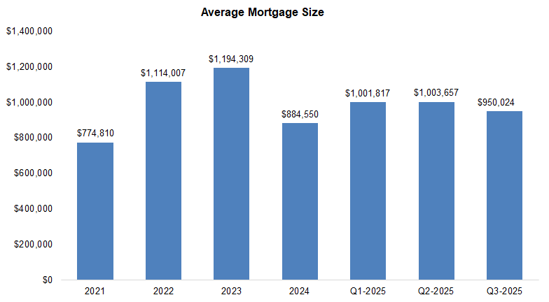 The average mortgage size fell 5% QoQ to $0.95M vs. the five-year average of $0.99M