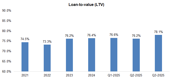 LTV rose 2 pp to 78%, above the five-year average of 75%, indicating higher risk
