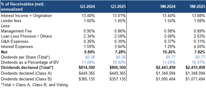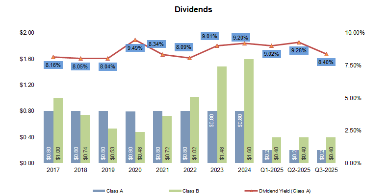 Dividends for Class A investors remained unchanged at $0.80/share, implying a yield of 8.26%