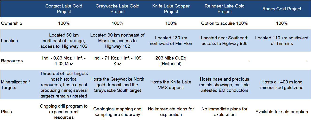 Five projects covering over 119,713 hectares of gold and copper assets in Saskatchewan and Ontario