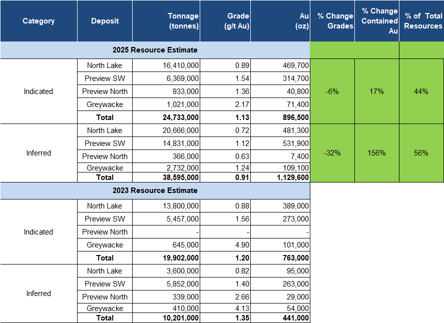 Resources were updated using a higher gold price of US$2,600/oz ( previously US$1, 6 00/oz), allowing the inclusion of previously uneconomic lower-grade material. 2025 Resource - Contact Lake and Greywacke