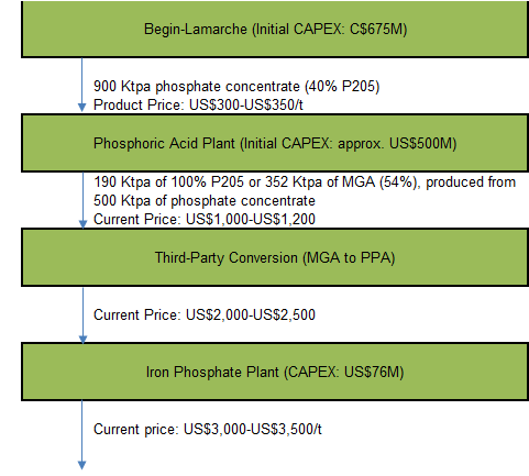 PHOS recently completed an internal economic study, details of which remain undisclosed, but management has indicated the results were robust enough to move the project forward. The study assumes that 500 ktpa of the 900 ktpa concentrate expected to be produced at Bégin-Lamarche will be used to produce 190 ktpa of value-added phosphoric acid (100% P₂O₅) or 352 ktpa of merchant-grade acid (MGA: 54% P₂O₅).