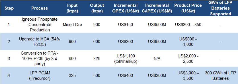 Product pricing ranges from US$300–350/t for igneous phosphate concentrate, US$800–1,000/t for MGA, US$2,000–2,500/t for PPA, and $10,000–15,000/t for LFP cathode active material (CAM)