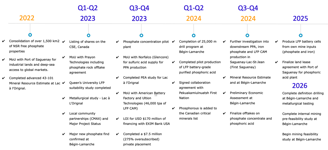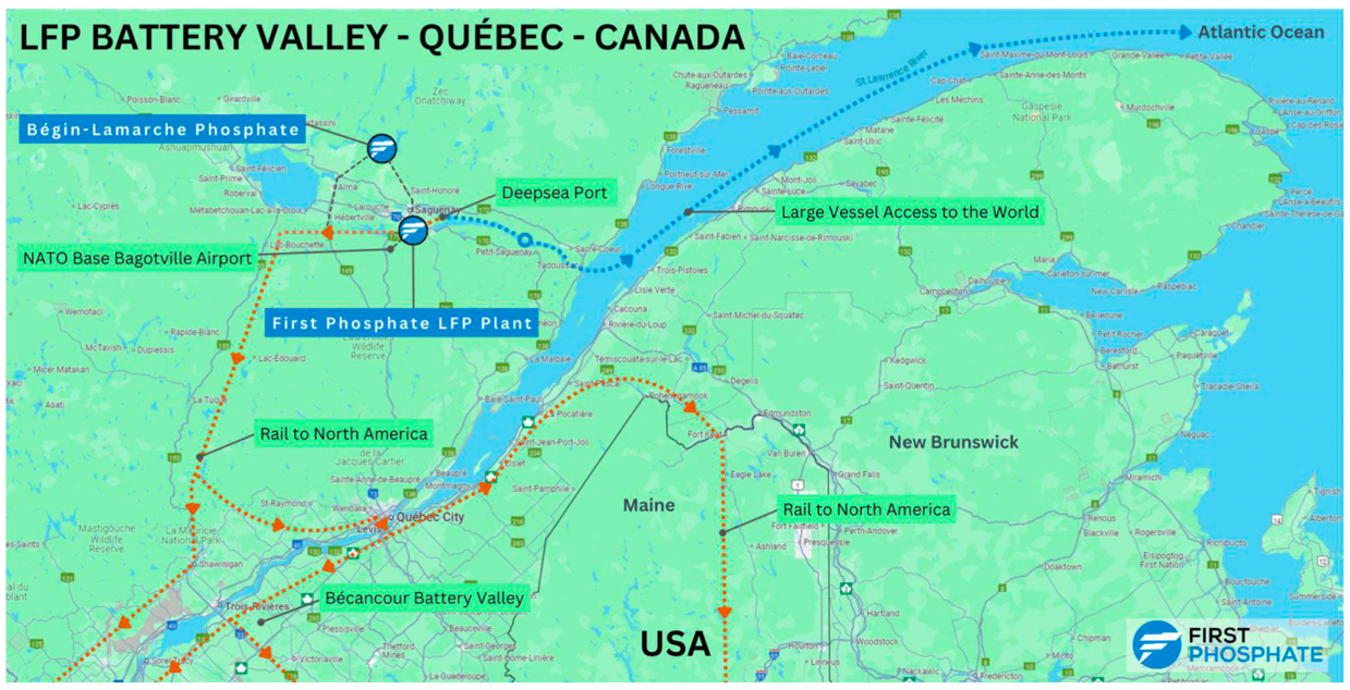 The company plans a 190 ktpa phosphoric acid (MGA) plant at the Port of Saguenay, about 70 km from Bégin-Lamarche. PHOS has finalized the land lease for the plant. The Canadian government announced a $58 M investment to build a second wharf next to PHOS’s proposed plant, providing a major supply chain advantage.
