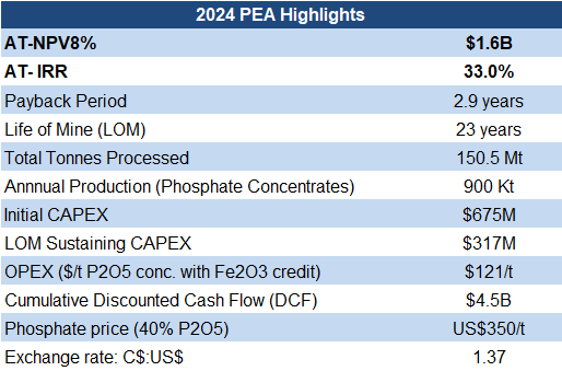 A 2024 PEA returned an AT-NPV8% of $1.59B, and a high AT-IRR of 33%, using US$350/t igneous phosphate concentrate (spot: US$305/t)