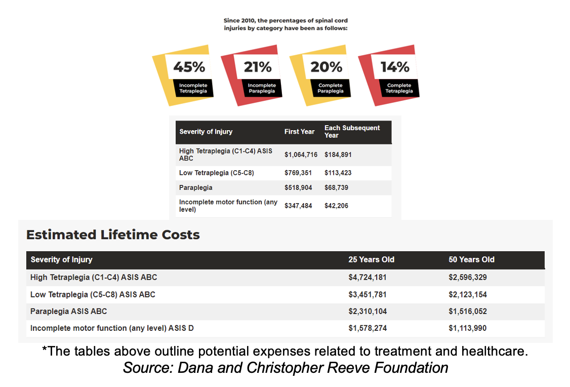 The Dana and Christopher Reeve Foundation reports that treating SCI can be extremely costly, especially for severe cases like high tetraplegia. In addition to substantial initial costs, ongoing care and rehabilitation expenses remain significant throughout a patient's lifetime.