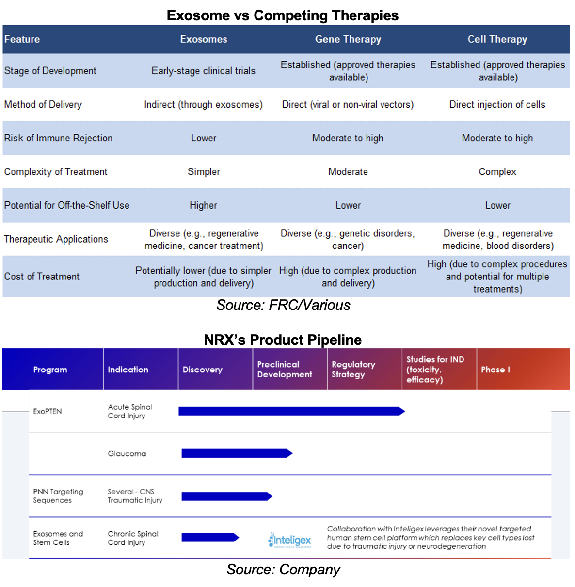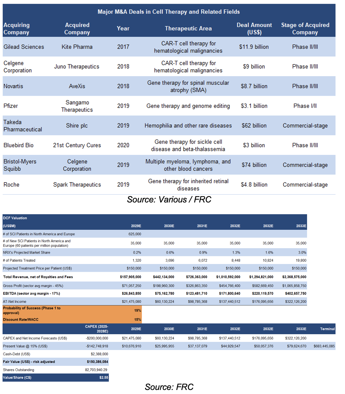 We are initiating coverage with a BUY rating, and a fair value estimate of C$2.61 per share (the average of our DCF and real options valuations). While NRX faces the inherent risks of an R&D-focused biotech, and exosome therapy remains a nascent field with no FDA-approved products, we view it as an innovative player in developing treatments for neurological disorders. Its lead candidate, ExoPTEN, has shown encouraging preclinical results, and received an Orphan Drug Designation. The typical exit strategy for pharma and biotech companies is acquisition by larger firms upon the successful completion of promising clinical trials.