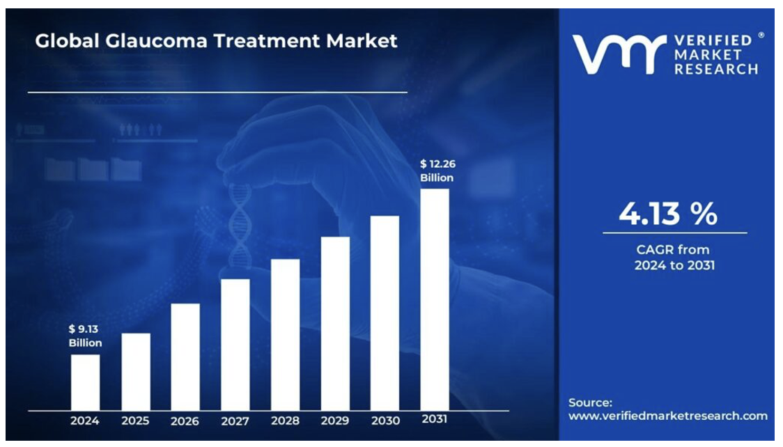 It is estimated that the global glaucoma treatment market will grow from $9.1B in 2024, to $12.3B by 2031, reflecting a CAGR of 4.1%, driven by an aging population, and increasing awareness and screening program