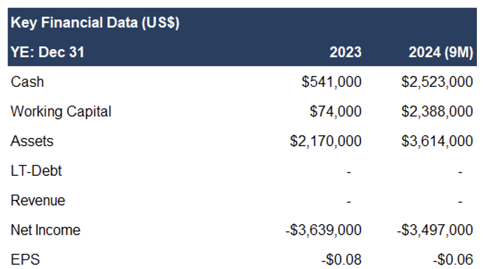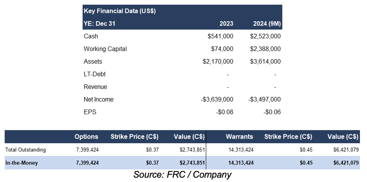 In pre-revenue stage. Current monthly burn rate : $400k/month. Raised $15M since inception. In-the-money options and warrants can generate up to C$9.2M; therefore, we do not anticipate any equity financings in the near term
