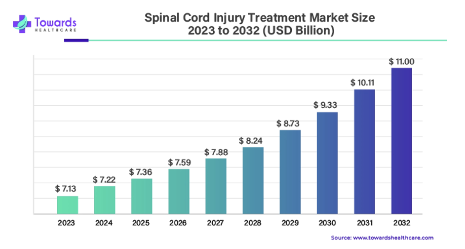 It is estimated that the global SCI treatment market will grow from $7.1B in 2023, to $11B by 2032, reflecting a CAGR of 4.8%