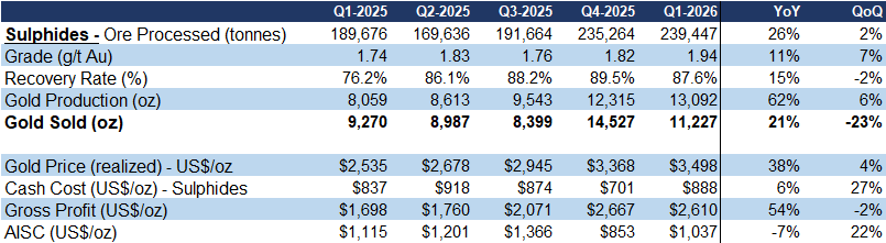Gross profit was up 54% YoY to $2,610/oz With 550-600 Koz of sulfide resources remaining, we believe the mine could produce forapproximately 12 more years Driven by higher production and gold prices, Q1revenue rose 67% YoY, EBITDA +66%, and
