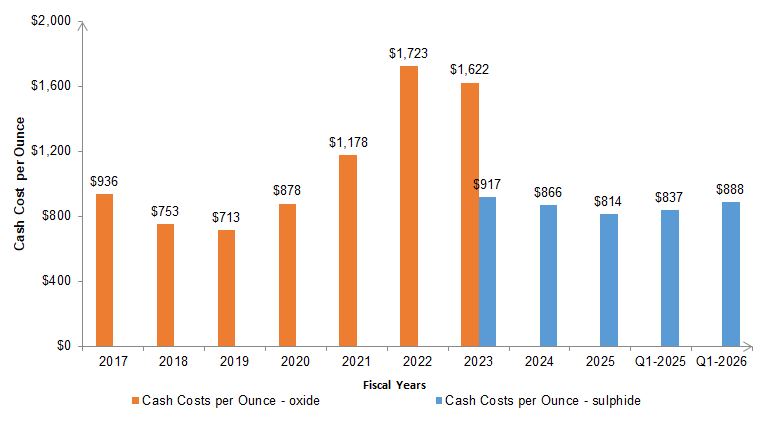 Cash costs were up 6% YoYto $888/oz, vs our estimate of $875/oz, mainly due to higher gold-price-linked royalty payments