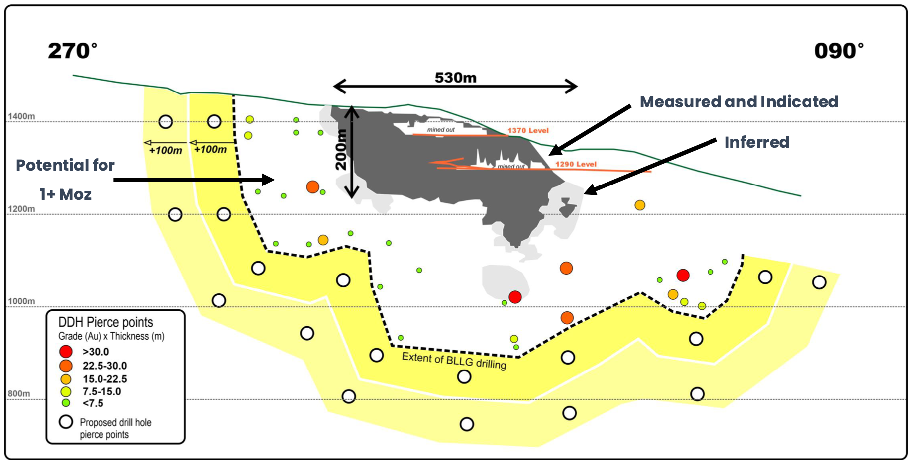 The current resource envelope, limited to the Boulder Main vein, measures 530 m long by 200 m deep and does not include drilling from 2022–2023 campaigns