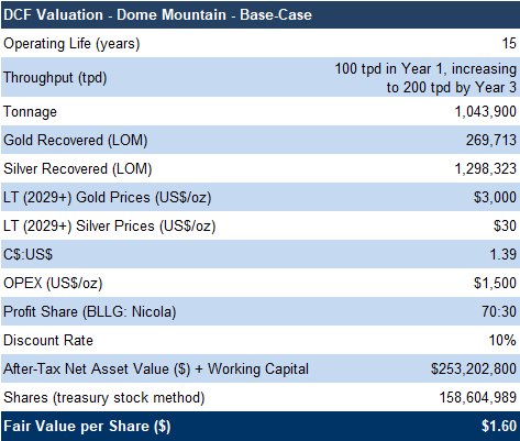 The mine is well connected, just a 50-minute drive from Smithers, B.C.Hosts high-grade veins averaging ~9 g/t, well above typical underground mine grades of 3–5 g/t A 2022 study identified a high-grade resource that we believe can support ~15 years of operations A key advantage of the project is its pre-existing underground development, and an active toll milling arrangement with Nicola Nicola’s mill is approximately 900 km from Dome Mountain. While long-distance trucking is challenging and cost-prohibitive for large operations, Dome Mountain’s relatively small-scale operation, and high-grade material, make it feasible BLLG has a 10-year milling profit share agreement with Nicola Mining for up to 75,000 tonnes per year (200 tpd)