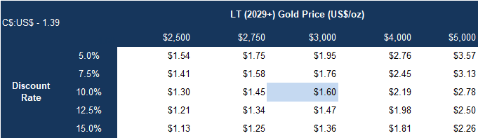 Our DCF valuation increased from $0.99 to $1.60/share, driven by higher gold prices, and increased production assumptions supported by a dedicated toll-milling facility Base-case gold price forecasts: US$4,250/oz in 2026, declining to US$3,000/oz by 2029+ (prior estimate for 2029+: US$2,500/oz)