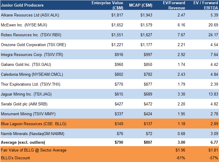 Our valuation increases to $2.23/share using the current spot price as the long-term average BLLG is trading at a 59% discount (previously 70%) to comparable junior gold miners Applying sector multiples, we arrived at a fair value estimate of $1.88/shareon BLLG (previously $1.24/share)