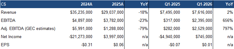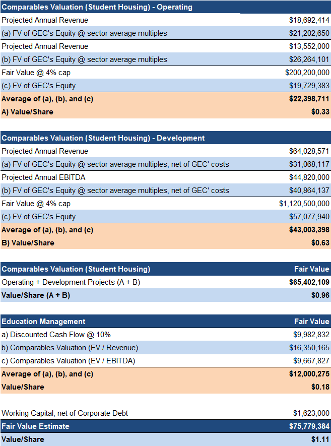 are reiterating our BUY rating, and adjusting our fair value estimate from $1. 09 to $ 1.1 1 /share. GEC delivered a solid Q1, with strength in student housing, margin expansion, and lower G&A expenses driving EPS above our estimate despite modest revenue softness.