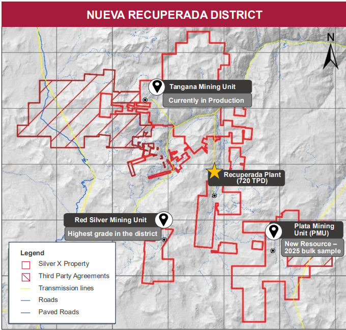 The Nueva Recuperada project includes the producing Tangana mine unit (TMU) with a 720 tpd processing plant, the advanced-stage Plata mining unit (PMU), and four exploration projects Extensive vein fields with 200+ targets, and 500+ outcrop veins