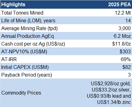 The 2025 PEA highlights the potential to increase annual production from ~1 Moz to 6 Moz AGX’s expansion plan involves two milling facilities: a new 1,500 tpd mill at Tangana, and the existing Recuperada mill (15 km south of Tangana), which will be expanded from 720 tpd to 1,500tpd Recuperada will be dedicated to processing ore from the PMU The PEA returned an AT-NPV10% of $303M, using $33/oz silver (spot: $64/oz), and $12/oz in cash costs