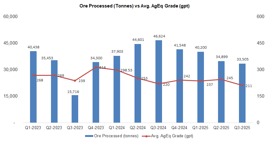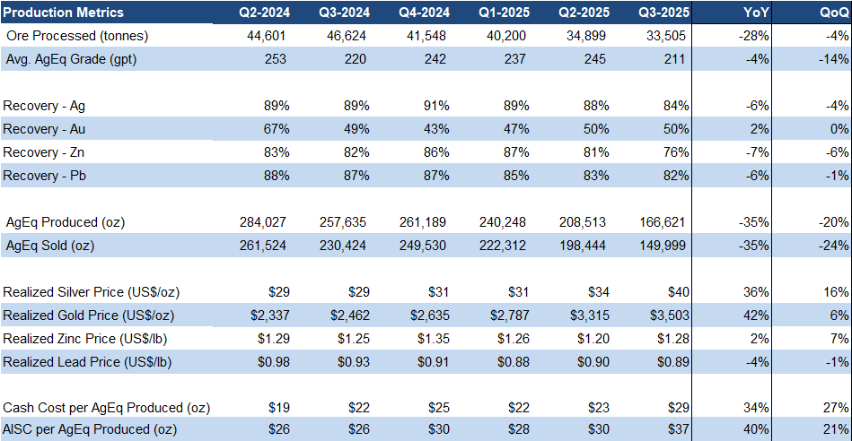 Q3 production fell 20% QoQ to 167 Koz AgEq, 11% below our estimate