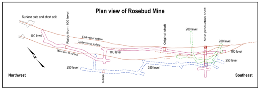 Gold and silver were first discovered here in 1879 . The property includes the past-producing Rosebud mine , which features the Southwick vein system – a large, double-layered gold and silver vein. It is estimated to stretch about 1,100 m along its length, with widths ranging from 0.3 m to 4.9 m. For context, many gold veins are only a few hundred meters long, and often less than 1 m wide, so the Southwick vein is long and relatively wide , making it a very promising target for mining.
