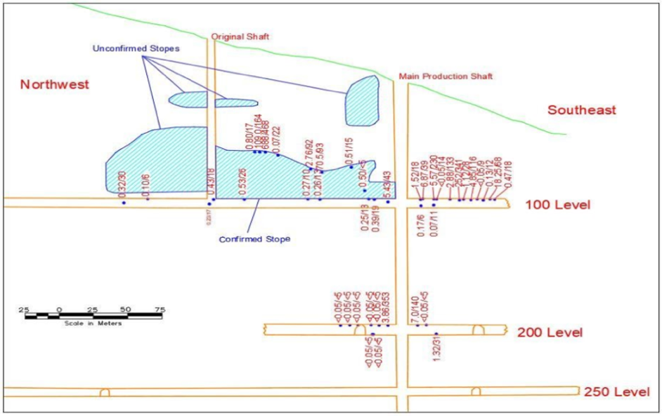 Historical production figures are not reliably documented , but reports suggest that about 8,400 tonnes of ore were mined, with extremely high gold grades of 15–20 ounces per ton (514–686 g/t Au), equivalent to roughly 150 Koz of gold, worth over US$700M at today’s gold prices.
