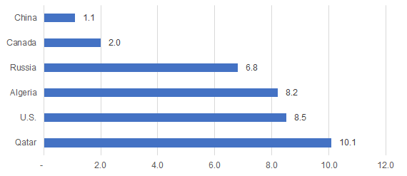 Global production declined from 2018 to 2023, due to depleting gas fields, but has since picked up with new supply coming online, primarily in Russia and Qatar