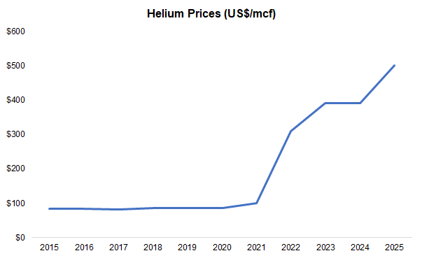 Helium prices have risen 488% over the past decade, with current contracts priced at US$400-600/mcf