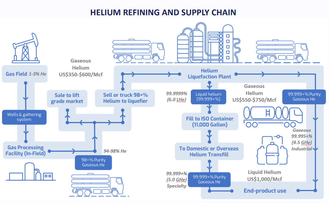 Helium is processed onsite, and delivered as 98% pure gas to end-users or liquefiers