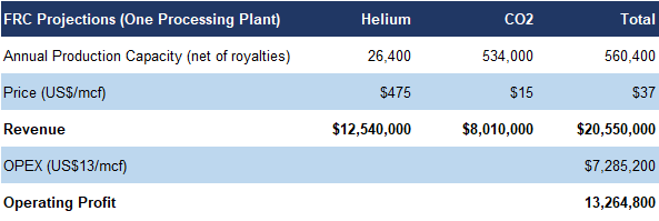 Pinon Canyon can process up to 26,400 mcf of helium, and 534,000 mcf of CO₂ per year, potentially generating US$21M in revenue, and US$14M in operating profit, at current prices