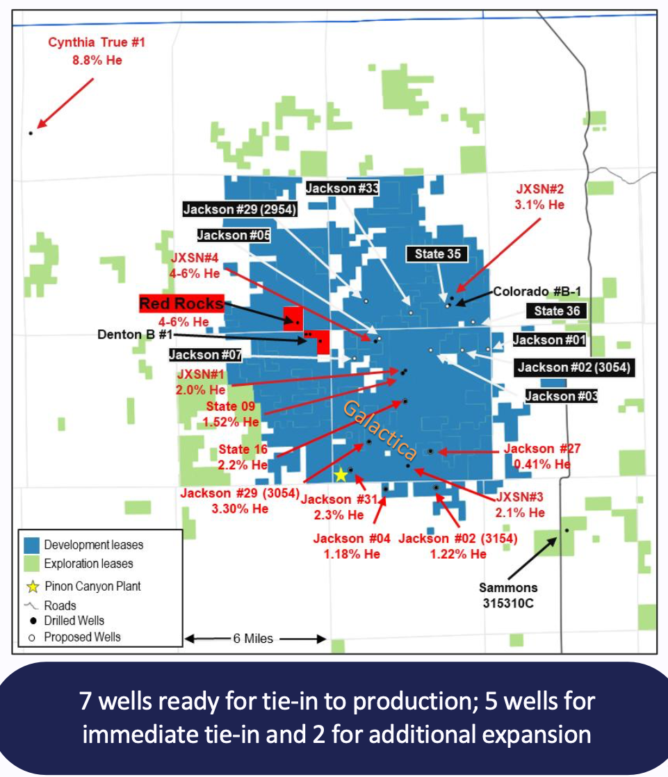 After the discovery, management planned a transition to production by completing a seven-well development program in 2025 , and building a processing facility, Pinon Canyon, at the Galactica site. This facility acts like a refinery, separating valuable helium from other gases to produce 98 % pure helium. They also built a gas gathering system, an underground network of pipes that carries raw gas from each well to the plant.