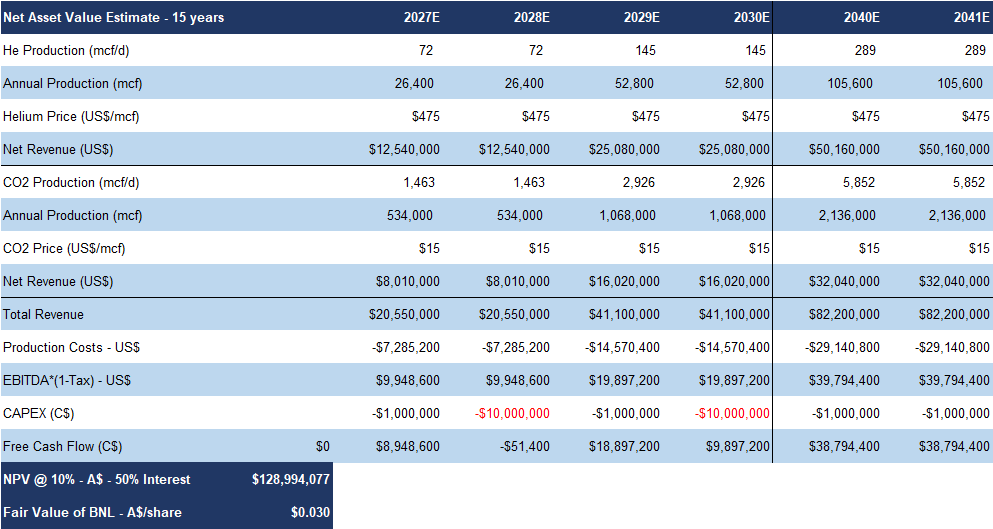 We are initiating coverage with a BUY rating, and a fair value estimate of $0.025/share (the average of our DCF and comparables valuations). BNL combines near-term production growth, long-life assets, and exposure to a tightening helium market. At 0. 2 5x our operating profit estimate vs peers at over 4x, we believe the market has yet to recognize its true potential. As production scales and market awareness increases, we anticipate the share price will move closer to our fair value estimate.