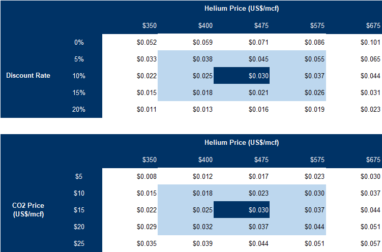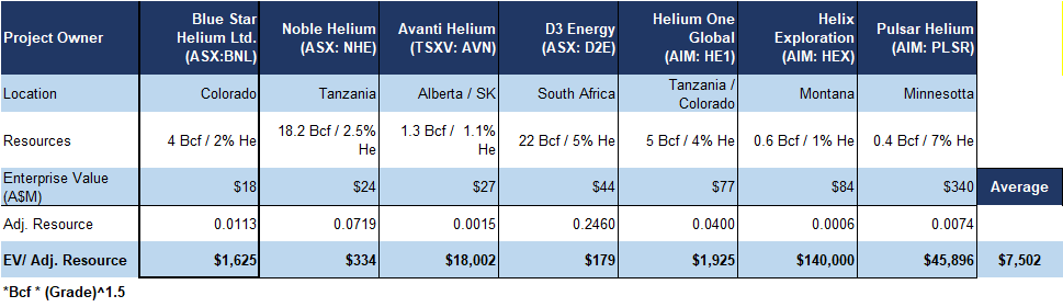 In our review of comparable helium juniors, we observed that MCAP is more closely tied to grade than to resource size. Therefore, instead of our standard E nterprise Value (EV) to resource metric, we use an adjusted EV to resource ratio that weights helium grade more heavily (exponent 1.5) alongside resource volume, creating a single metric for directly comparing project valuations.