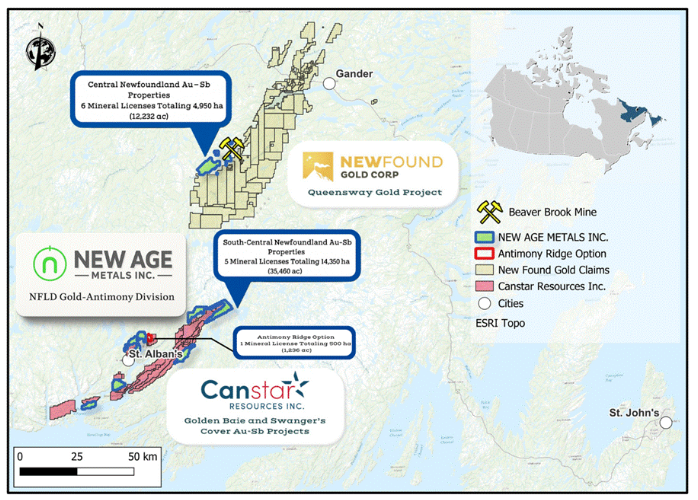 Strategically located near New Found Gold’s (TSXV: NFG) Queensway project, and along the same geological trend as the past-producing Beaver Brook antimony mine