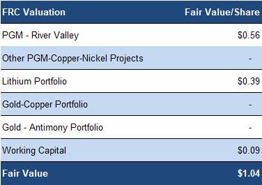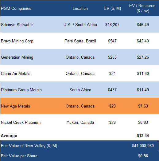 At $8/oz PGM (previously $7/oz), NAM continues to trade well below the comparables’ average of $13/oz (previously $12/oz)Applying the comparables average, our fair value estimate on River Valley increased to $0.56/share (previously $0.50/share)