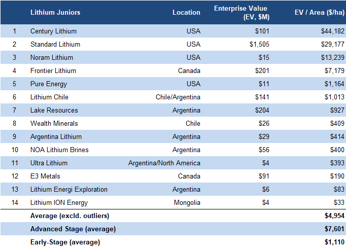 Early-stage lithium projects are trading at an average Enterprise Value (EV) of $1,110/ha (previously $1,023/ha)