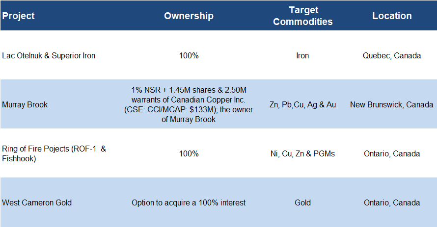 MQM holds 1. 45 M shares , and 2.50M warrants (exercise price $0.12; current share price $0.69), in Canadian Copper Inc. (MCAP: $133M), representing a current market value of $ 2.50M.