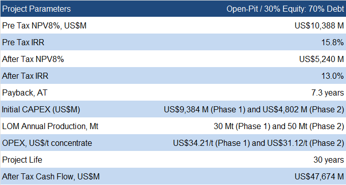 The previous feasibility study (2015) reported an after-tax NPV8% of US$5.24B, based on an iron ore price of US$105/t (vs. the current spot price of US$100/t)