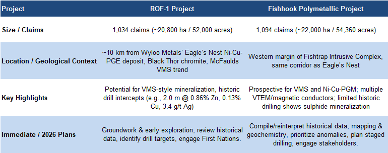 The Ring of Fire is one of Canada’s largest undeveloped mineral districts , rich in critical minerals such as nickel, copper, and platinum-group metals (PGMs). MQM has staked two projects in the regio n : the ROF-1 p roject (~20,800 ha) , and the Fishhook p olymetallic p roject (~22,000 ha). Based on limited historical work, ROF-1 is prospective for nickel, copper, and PGMs, while the Fishhook is prospective for copper-zinc, nickel, and PGMs.