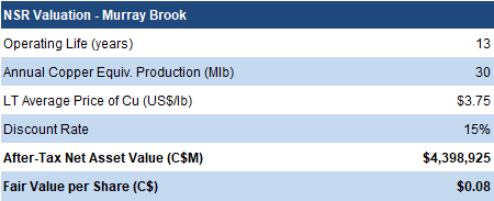 MQM also retains a 1% NSR royalty on CCI’s Murray Brook Project , located in the Bathurst Mining District, New Brunswick. The project hosts a large, low-grade open-pit polymetallic deposit. CCI can buy 0.17% of the royalty for $1 M , and must pay MQM $1 M once the project starts producing. A recent independent study ( Preliminary Economic Assessment) outlined an after-tax NPV7% of $171 M, and an IRR of 36%, based on US$4.25/lb Cu (spot price: US$6.04/lb) , with a relatively low initial CAPEX of $64 M . CCI plans more drilling this year to expand the deposit, which could increase the project’s value if successful.