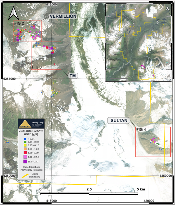 Vermillion Zone: 217 g/t gold and 0.44% copper; 65.7 g/t gold, 31.5 g/t silver, and 0.31% copper (rock chip samples)