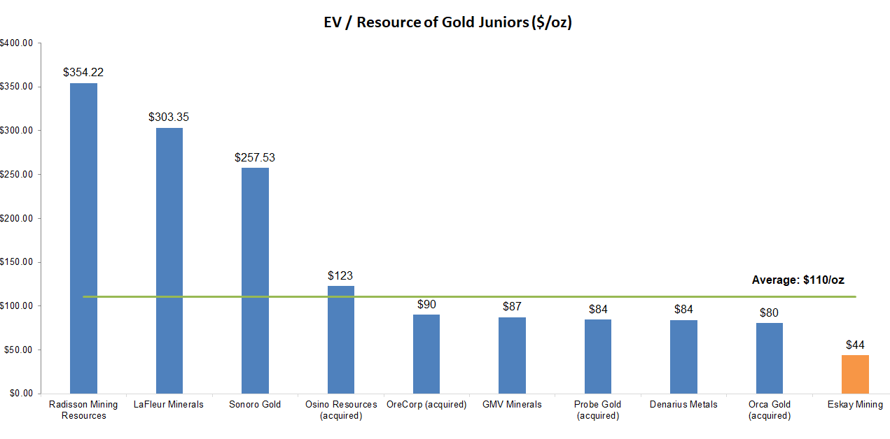 ESK is trading at $44/oz (previously $24/oz) vs a comparables average of $110/oz (previously $105/oz)
