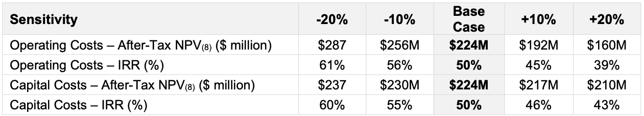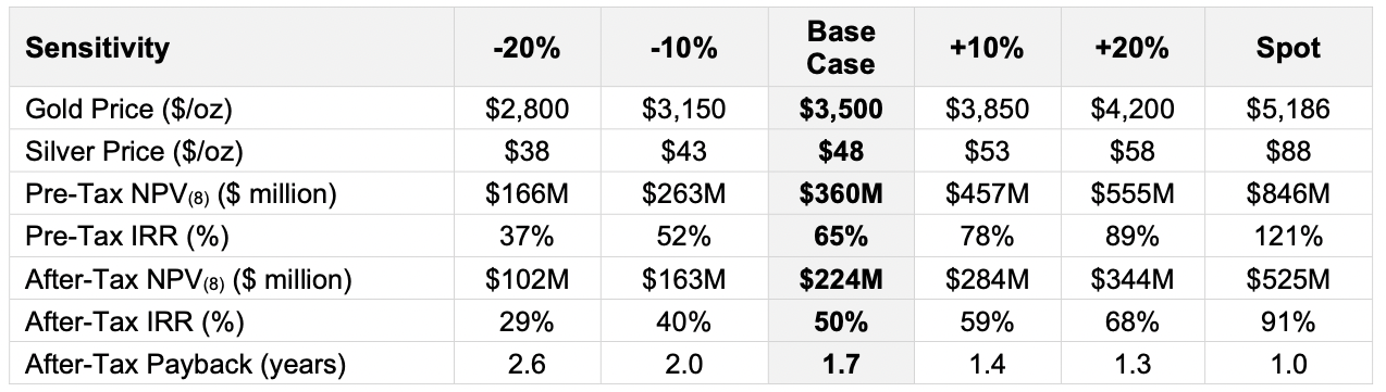 AT NPV8%: US$224 M, AT IRR: 50% (US$3,500/oz gold; spot: US$5,090/oz); for context, we view IRR >15% as strong for mining projects