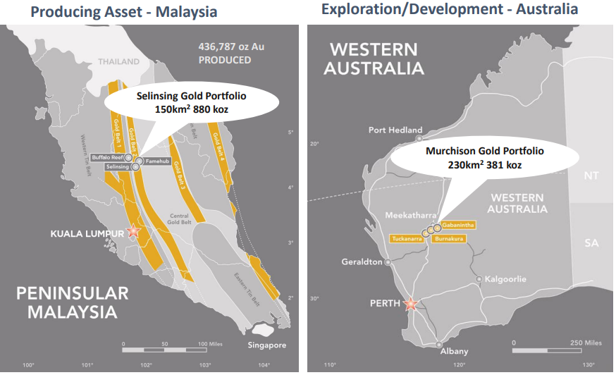 Owns a producing gold mine in Malaysia, and exploration projects in Western Australia