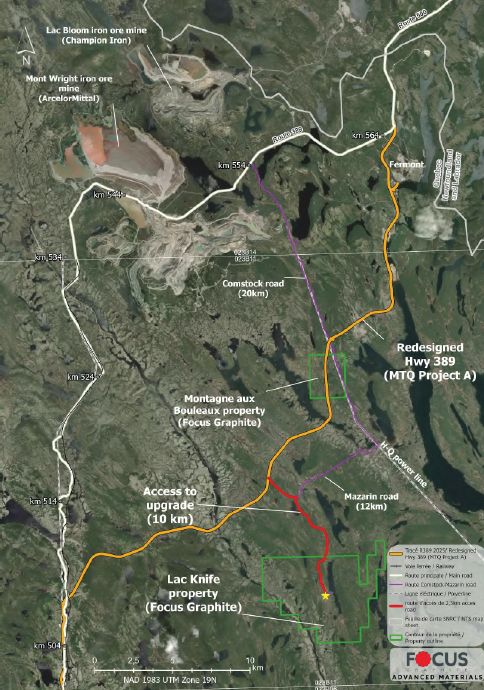 Strategic location: 27 km south of Fermont, near major iron ore operations including ArcelorMittal (NYSE: MT), Rio Tinto (LSE: RIO), and Champion Iron (ASX: CIA)