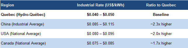 Electricity rates in Quebec are far below those in China, the U.S., or across Canada