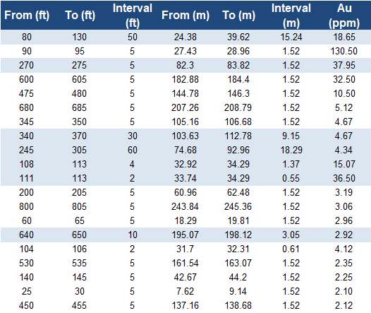 Historic drilling returned impressive high-grade gold intercepts, such as 18.3 m at 4.3 g/t (including 1.5 m at 37.8 g/t), and 15.24 m at 18.65 g/t; by comparison, the global average grade of gold mines is 1–2 g/t
