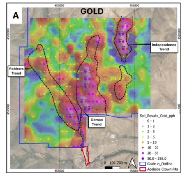 Soil tests found three large gold-silver areas, each about 1 km long: Robbers, Gomes, and Independence