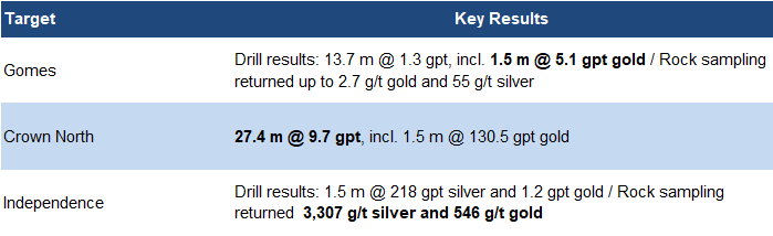 The other two targets, Gomes and Independence, show signs of a different type of gold and silver mineralization called epithermal, which usually hosts high grades, but in smaller deposits